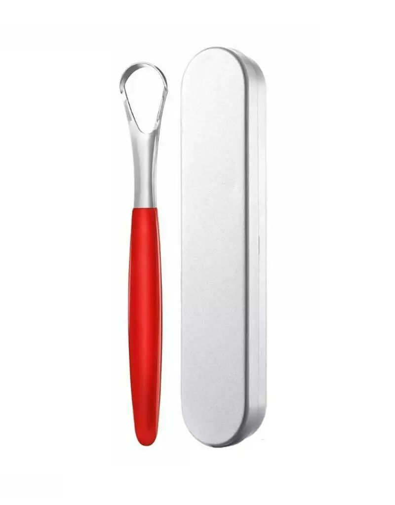 Щетка скребок для чистки языка, металлическая в металлическом чехле, красная ручка